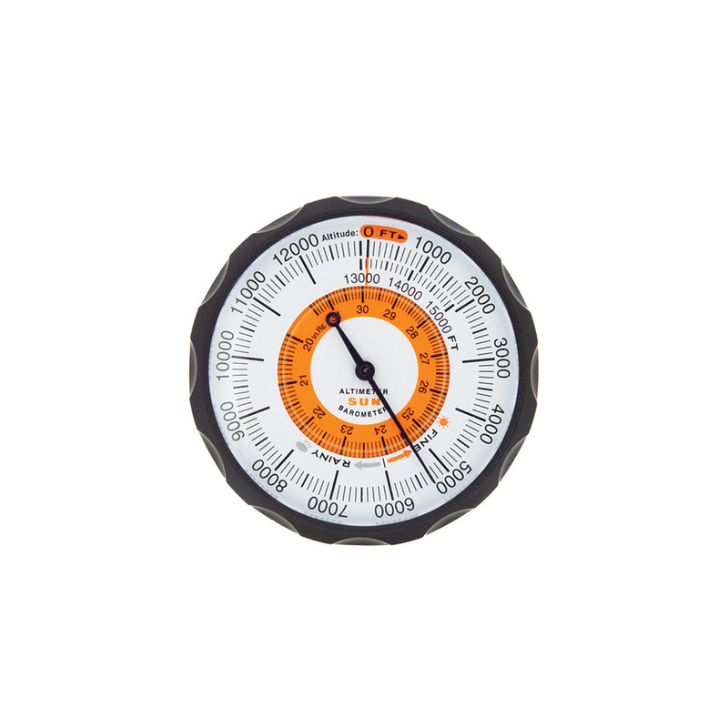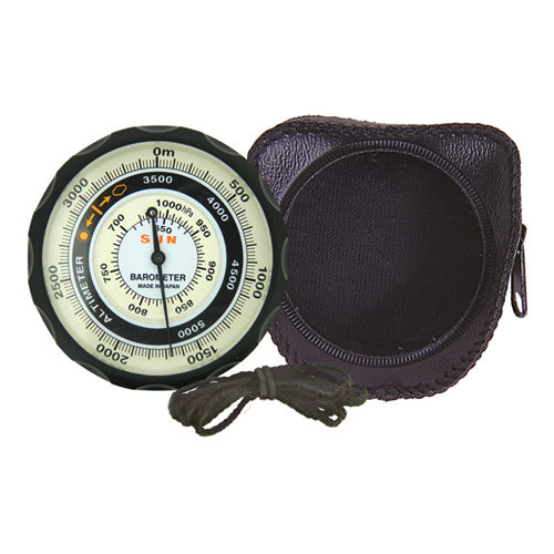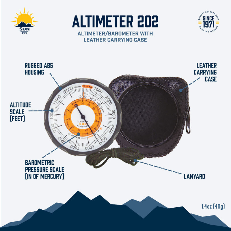 Measure the altitude wherever you go! Get accurate altitude and barometric readings in either feet (#202-F) or meters (#202-M) as you trek through the mountains, valleys, or anywhere else life takes you. Easy to pack along and lightweight for every adventure. Analog design includes a weather trend indicator, keeping you aware of storms building at high altitude. Includes a lanyard and leatherette case with belt loop.