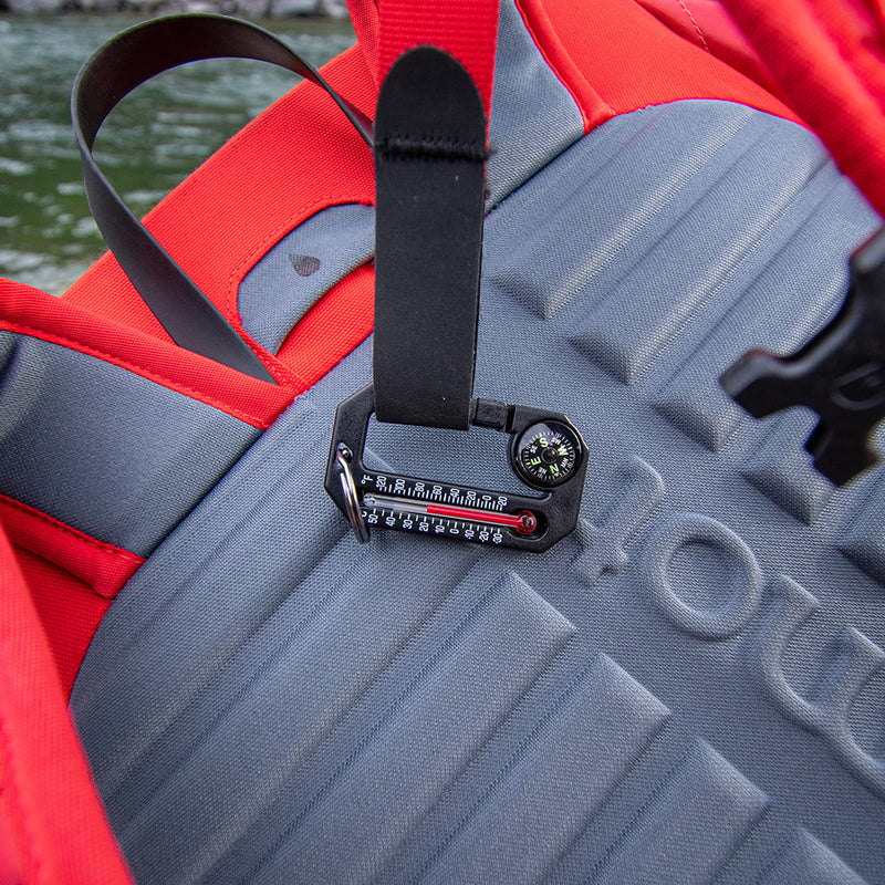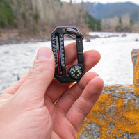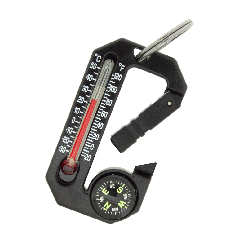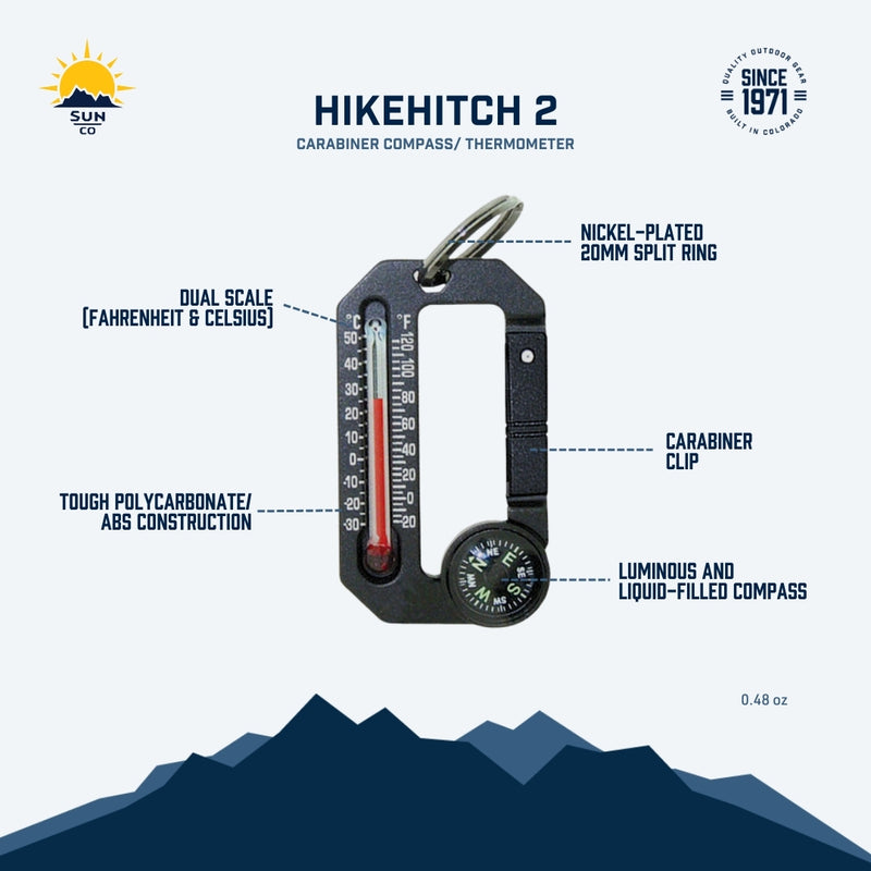 This handy carabiner includes a thermometer and compass. Clip the handy carabiner to your jacket or pack, keychain, or use as a zipper pull with included split ring. Perfect addition to any camping, hiking, backpacking, or travel gear. Thermometer reads in Fahrenheit and Celsius scales down to -20°F and -30°C. The small thermometer provides accurate readings and is perfect for any outdoor adventure! Its lightweight design allows you to take HikeHitch 2 anywhere you'd like. Compass is luminous and liquid-filled. Not for load-bearing use.