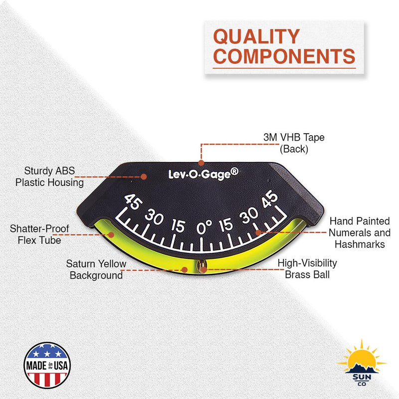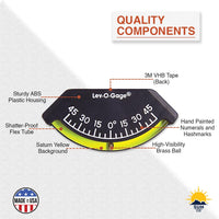 Lev-o-gage mounts easily on bulkhead (no hardware required), to monitor heel angle. Aids in trimming sails for optimal speed. Made in USA. Tube assembly made of special shatterproof copolymer. Monitors tilt angle from -45 to 45 degrees. Brass indicator ball rides in special damping fluid. Numerals/hashmarks are engraved and hand painted for long life and great visibility. Saturn yellow tube assembly for easy reading. Mounts with high-bond tape. Its convenient size will allow for mounting on almost any surface. No hardware required.