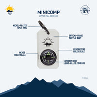 Instant navigation is at your fingertips with the MiniComp. The split ring allows for the MiniComp to be attached to any and all types of gear. Includes inches/cm ruler on each side. Luminous compass allows you to determine direction even in low light conditions. Solid brass split ring won’t affect compass reading. Optical-grade clear acrylic housing. The lightest compass of its size at just 0.4 oz. From hiking and climbing, to camping and backpacking, the MiniComp is the perfect addition. Just attach to the zipper of a jacket or pack, or attach to a keychain.