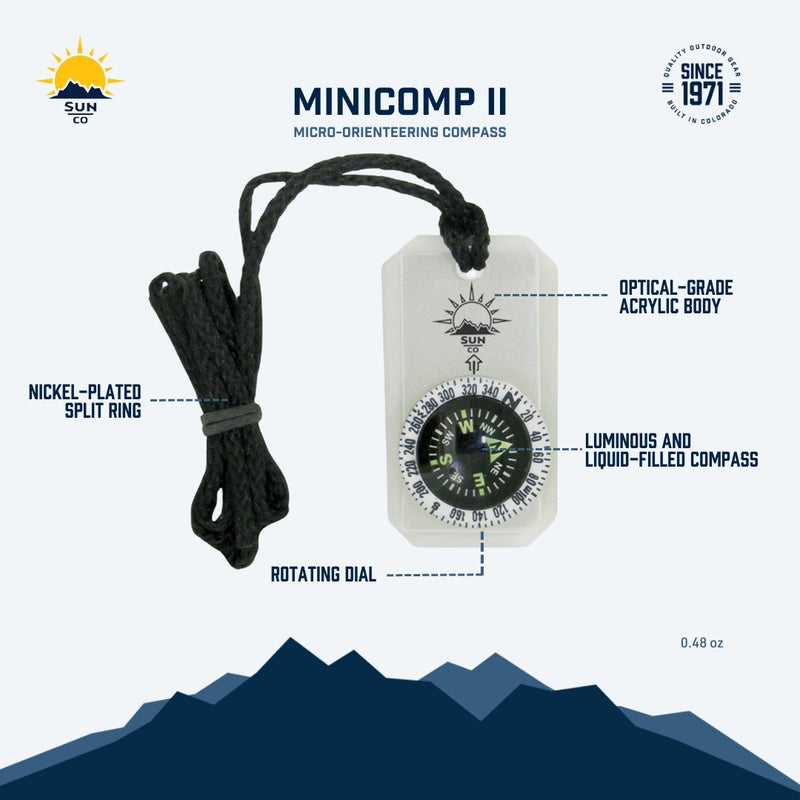 The MiniComp II is a unique micro-orienteering compass. Compass is fluid-filled and includes a luminous dial. Works great in addition to GPS or as a backup orienteering compass. Optical-grade clear acrylic housing. Includes inches/cm ruler on each side and a 16" lanyard.
