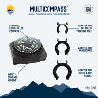 This 4-in-1 compass kit comes with three adapters to meet your orienteering needs. The original housing allows you to wear it as a wrist compass, conveniently sliding onto your watch band or bracelet. The smallest adapter lets you attach it to a ski or trekking pole. For cyclists, motorcyclists, or ATV/UTV enthusiasts, the mid-sized adapter securely fastens to your handlebars. And for water sports enthusiasts, the largest clip lets you connect it to your stand-up paddleboarding or kayak paddle. With our innovative "click-n-lock" system, changing out adapters is quick and easy.