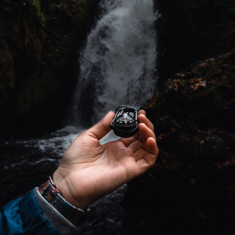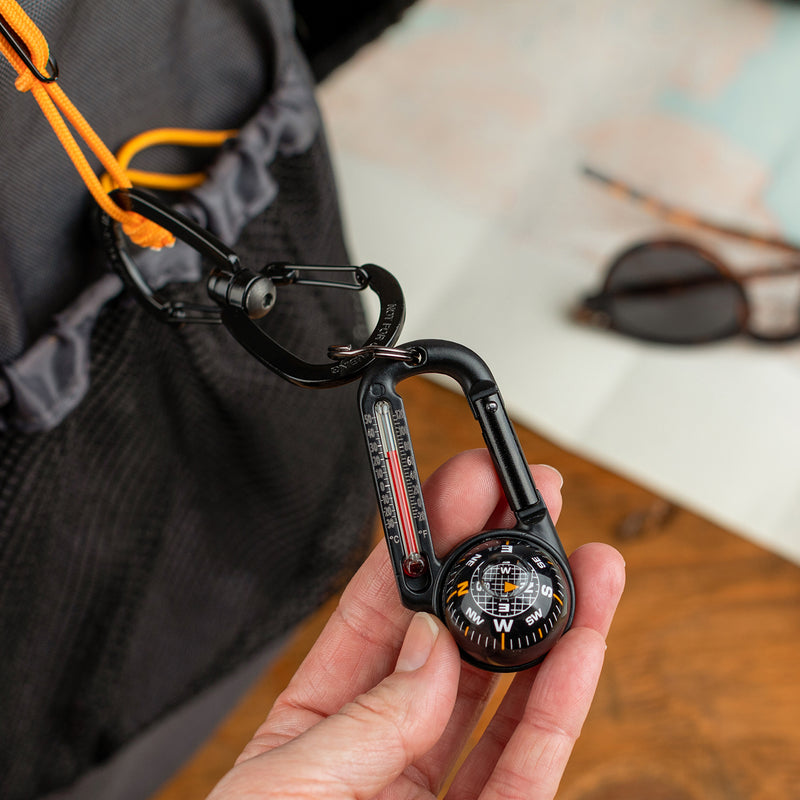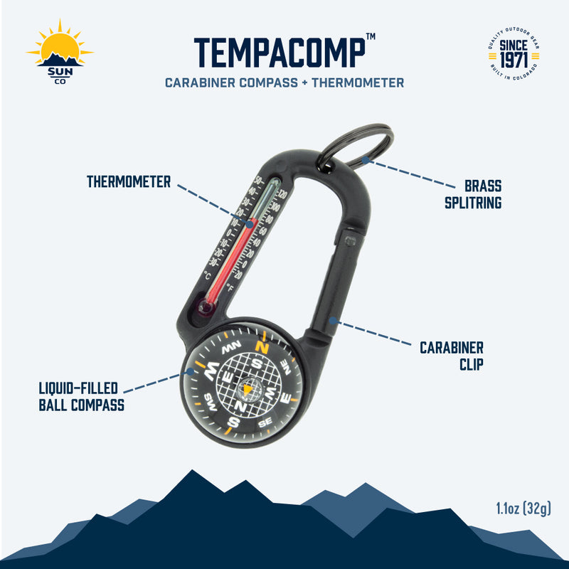 TempaComp has a thermometer and compass, all on one handy carabiner. Easily attach it to your pack, jacket, keychain, or wherever you might need it. Whether you are hiking, camping, backpacking, or hunting, the TempaComp is the perfect accessory for your adventure. Just clip and go! The ball compass is readable at any angle and displays both cardinal points and direction of travel. Thermometer reads down to -20º Fahrenheit (-30º Celsius). Not for load-bearing use.