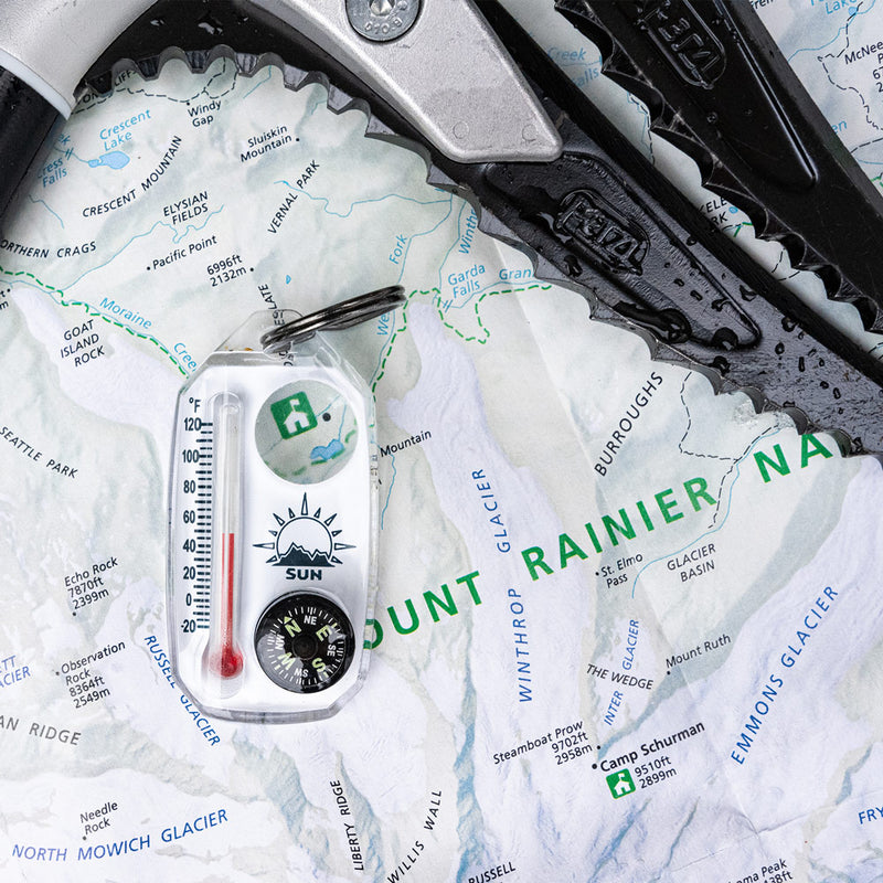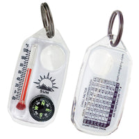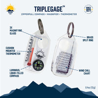 Get an instant weather report, direction, and magnification at your fingertips with the TripleGage! Attaches to your coat, pack, keychain, or wherever else you need it. Luminous, liquid-filled compass allows you to determine direction even in low light conditions. Reads down to -20º Fahrenheit and includes a wind chill chart. Magnifies by 3X. Solid brass split ring won’t affect compass reading. The perfect companion on hikes, camping trips, or even out on the water!