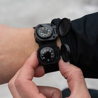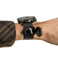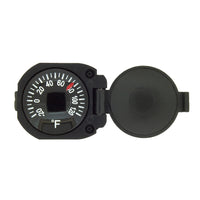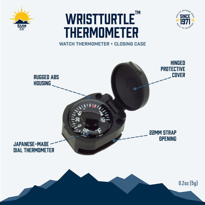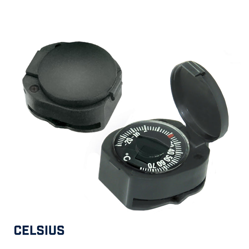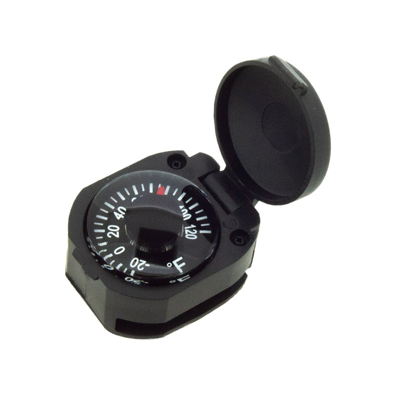 Temperature at a glance! This impact-resistant thermometer with hinged protective cover fits snugly on most watch bands. The perfect accessory to your hiking, camping, or backpacking gear. The Japanese-made dial thermometer is highly accurate, liquid-damped, and measures from -20º to +120º Fahrenheit. A great addition to any watch. Just slip it on and go!